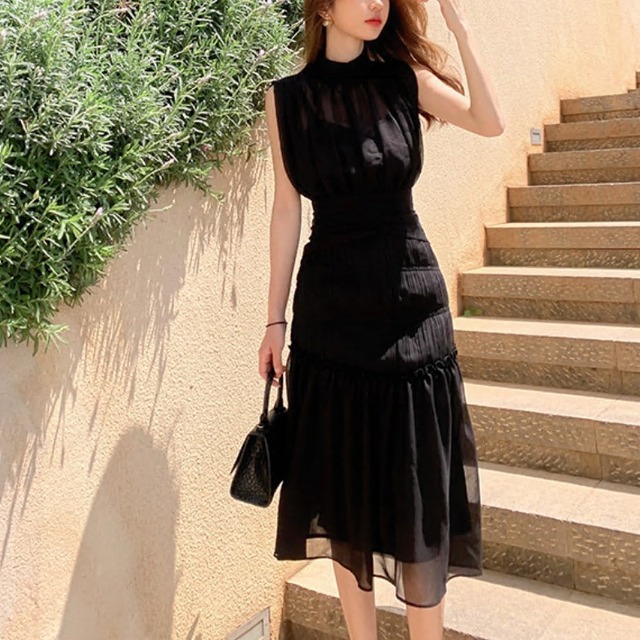 • シフォン☆パーティードレス ティアード ノースリ ハイネック